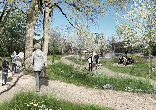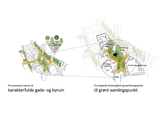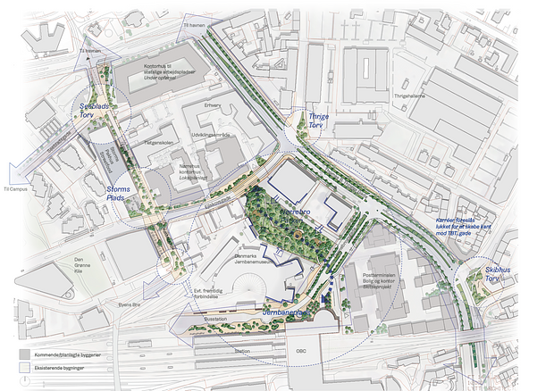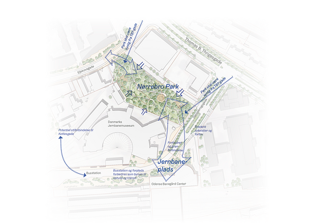 Området bag Danmarks Jernbanemuseum omdannes samtidig til et nyt samlingssted: en grøn velkomstpark, som kan blive hele kvarterets hjerte og en Nørrebro-pendant til midtbyens Kongens Have. Der lægges samtidig op til en forbedret nordlig stationsplads og forbindelse ind i Nørrebrokvarteret, så der skabes en tryg, inviterende og tydelig stiforbindelse.
