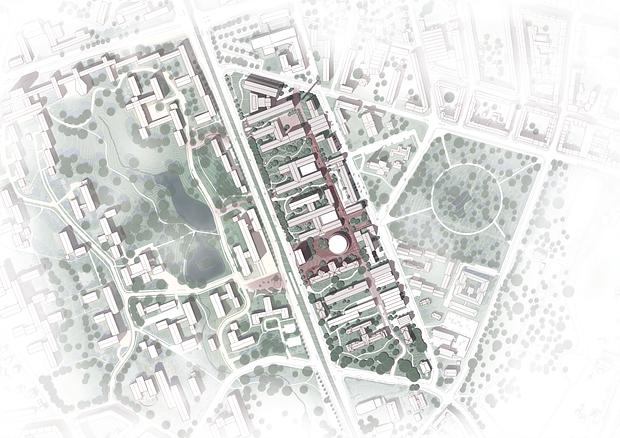 Projektet Aarhus BSS bygger videre på den masterplan og designmanual, som vi udarbejdede i 2018. I Masterplanen arbejdes der med en bevarende tilgang til den eksisterende arkitektur og homogenitet, og der arbejdes ud fra et ønske om at udvikle stedet på dets egne præmisser. Der bygges således videre på bebyggelsesstrukturen såvel som den materialepalette, der allerede eksisterer. I projektet skabes en differentiering mellem byrummenes karakter, som udover at omfatte en central plads også indeholder en række mindre urbane rum samt mindre grønne lommer. Langs den centrale gade, Universitetsstrøget, og omkring de større pladser i området placeres udadvendte funktioner og der skabes aktive facader, som skal give området en mere åben karakter. Den indre bygade og de tilstødende byrum bliver et centralt og visuelt element, der bidrager til stedets identitet gennem brugen af røde teglsten, som kendetegner det tidligere hospital.