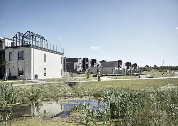 Parkeringsarealerne er organiseret på bebyggelsens yderside og således holdes den centrale del af boligområdet bilfrit og sikrer optimal sammenhæng til de omkringliggende naturområder. Terrænet er svagt bearbejdet, så stier og grøfter ligger lavt i terrænet, mens bygningskroppe er placeret en smule hævet på en række landskabsøer, der skyder sig ud i terrænet. Derved skabes et bølget og oplevelsesrigt terræn samt differentiering mellem private haver og offentlige stier. Udearealerne fremstår naturlige i sit udtryk og er kendetegnet ved frodige grøfter, lange græsser og opstammede træer, hvilket giver beboerne oplevelsen af tæt kontakt til naturen samt godt overblik og tryghed i området.