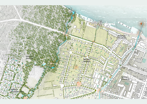 Med introduktion af tre vandveje, der relaterer sig til tre forskellige bykvarterer: Skovkvarteret, Allékvarteret og Bykvarteret, viser vi vandets mangfoldighed, når det bevæger sig ned gennem den stejlt skrånende bydels gader. "Aktivitetsskoven" er bydelens nye rekreative område med varieret planterigdom og et stort udvalg af rum og elementer, der inviterer til forskelligartet leg og idræt.