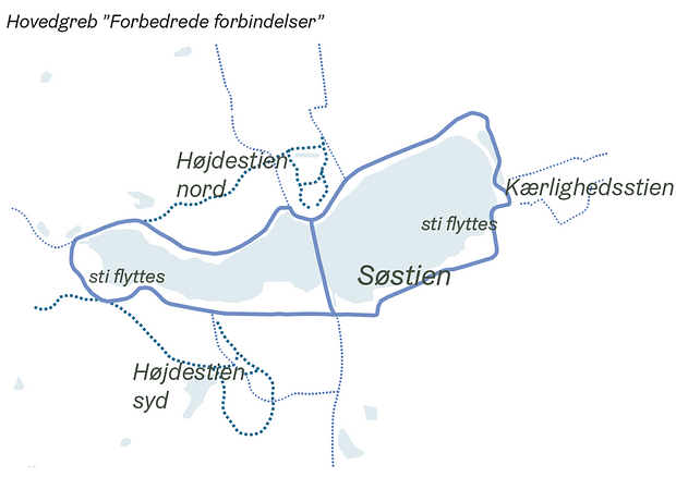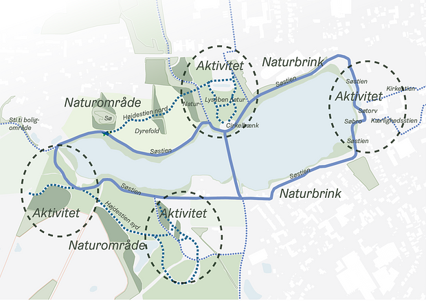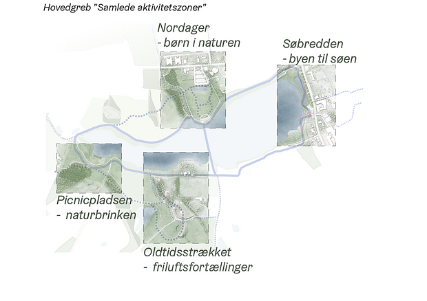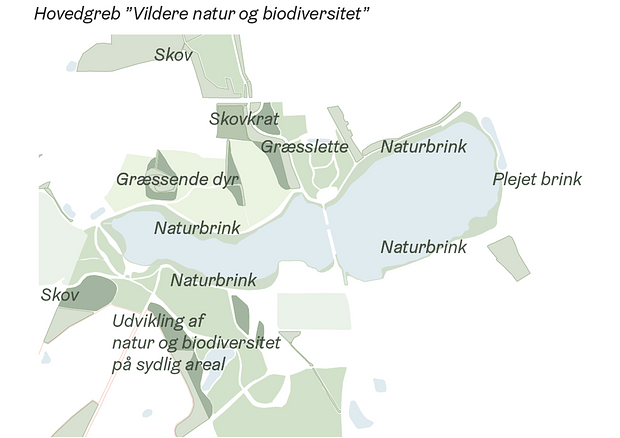 Udviklingsplanen hviler på tre hovedgreb: samlende aktivitetszoner, vildere natur og biodiversitet samt forbedrede forbindelser. Aktivitetszonerne skaber rum for ophold og fællesskab, mens store dele af området friholdes til naturen, hvor fugle- og dyreliv kan udfolde sig. Forbindelserne mellem by, sø og landskab styrkes, så området bliver lettere tilgængeligt og oplevelsesværdien øges.