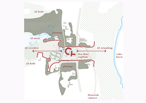 Tønnisgård har historisk ligget frit og markant på den åbne engflade – præcis hvor Vadehavets værdifulde strandenge og marskland i øst møder klitheden og moserne i vest. Senere er plantagerne kommet til, og i dag ligger kommandørgården indrammet af markante bryn, med lange kig mod Vadehavet og horisonten. Det landskabelige hovedgreb tager derfor naturligt afsæt i områdets historie og de eksisterende landskabelige kvaliteter. Den åbne engflade udspændes og defineres af en samlende engvegetation – et gradueret tæppe af plantearter fra strandeng og marsk til klithede og moser.